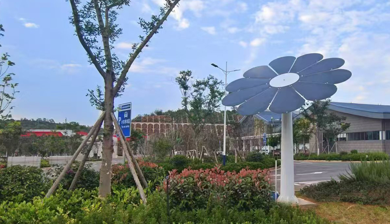 2023年,兩朵“會追日”的光伏太陽花在深圳北站廣場驚艷亮相,成為一道獨特的科技與藝術景觀。該項目不僅以其智能追光系統高效發電,更兼具藝術觀賞與夜間照明功能,完美詮釋了綠色基礎設施的多元價值。其創新的設計理念與顯著的示范效應,獲得了深圳衛視的重點報道,被視為深圳推動綠色低碳城市建設的生動典范,向公眾展示了科技與自然和諧共生的未來城市圖景。